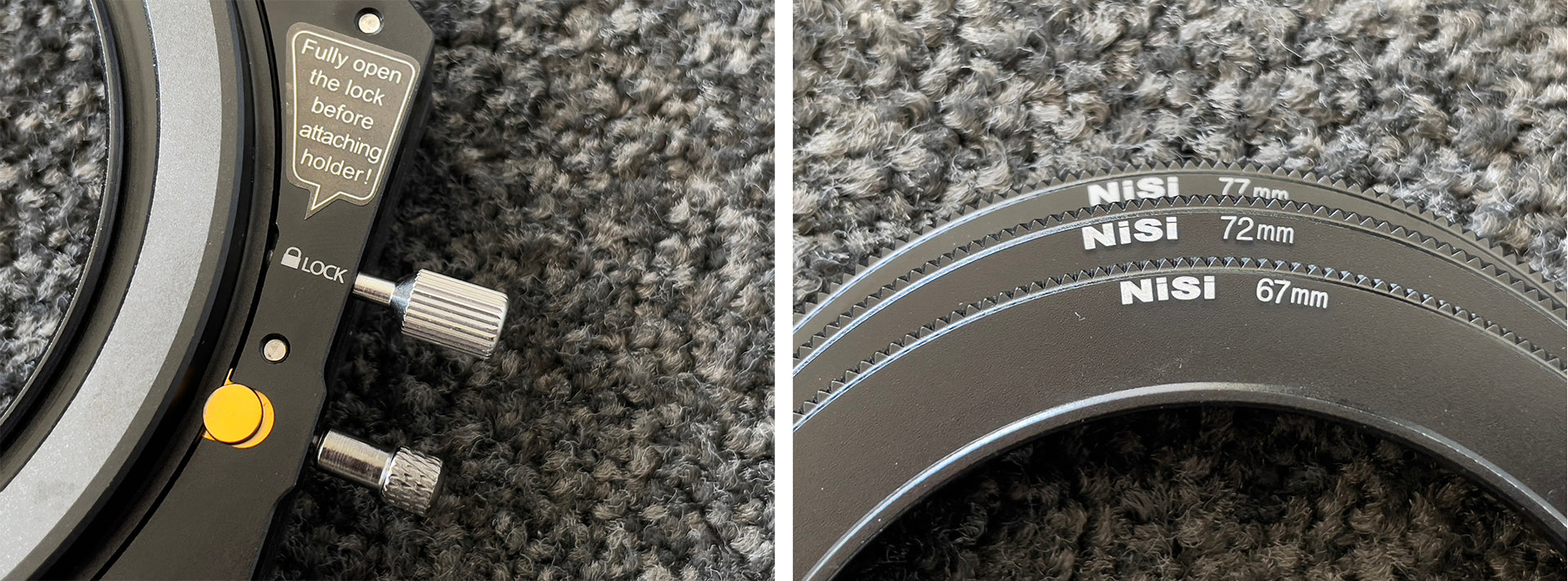 The front mount is octagonal in shape, with a bevelled design that exposes all four corners of the filter, making it easy to remove the filter. And with guide slots for each slot, filter removal and installation is very smooth. There are two knobs on the side of the holder. One knob is pulled outwards to remove the holder. The other knob is a safety lock that locks the mount so that it does not rotate. The main holder of the holder system is 82mm, which is becoming more and more common with professional zoom lenses, so it is only logical that 82mm has become the standard for the holder. The Nisi V6 also comes with adopters for smaller lenses, 77mm, 72mm and so on. If your lens is not 82mm, you can mount the adapter on the lens first and then put the holder on it. I bought the v6 landscape kit, which includes a landscape CPL for enhanced color, and the Nisi V6 holder allows you to use three square filters at the same time, and you can also attach a CPL filter, so you can use a total of four filters.