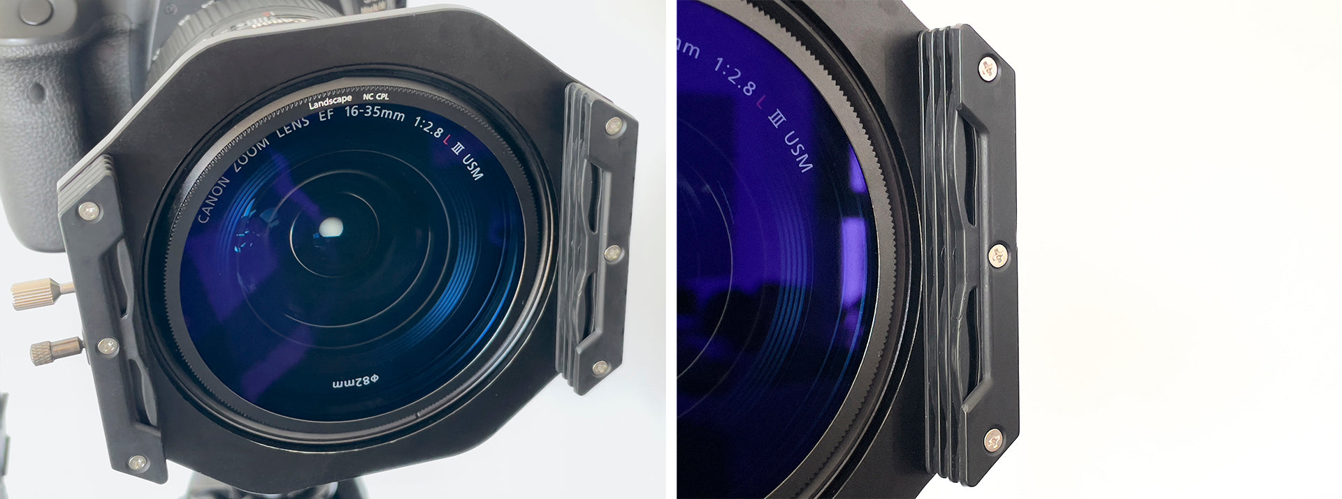On full frame cameras, the most used lenses for landscapes are basically zoom lenses such as 16-35mm, 24-70mm, 70-200mm, and some wide angle fixed focal length lenses with large apertures. Filter holder is not difficult to design and make for length lenses, but for wide angle lenses they can easily create vignetting, the Nisi V6 holder is a good solution to this problem. A very small cut-out in the outermost slot of the filter holder solves the problem of vignetting on wide angle lenses.