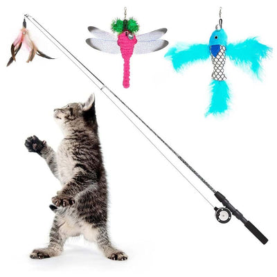 - 🐟 【 4 PCS Interactive Toy 】:1 Fishing pole cat wand + 3 different refill attachments with bell included (flying fish, feather and dragonfly) to keep your cat interested, arouse its curiosity and provide endless fun.